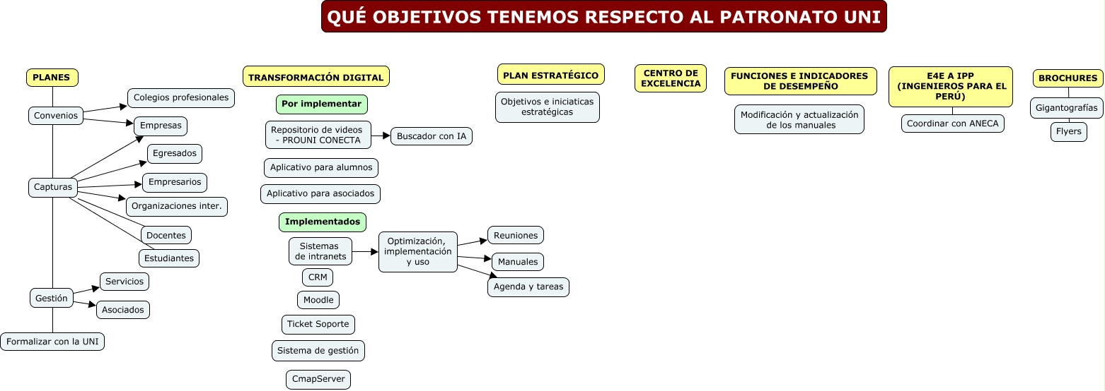 Este Cmap, tiene información relacionada con: QUÉ OBJETIVOS TENEMOS RESPECTO AL PATRONATO UNI, Capturas Organizaciones inter., Capturas Estudiantes, Convenios Colegios profesionales, Capturas Docentes, Capturas Egresados, Capturas Empresarios, Optimización, implementación y uso Reuniones, Gestión Servicios, PLANES Formalizar con la UNI, Capturas Empresas, Convenios Empresas, Sistemas de intranets Optimización, implementación y uso, Repositorio de videos - PROUNI CONECTA Buscador con IA, E4E A IPP (INGENIEROS PARA EL PERÚ) Coordinar con ANECA, Optimización, implementación y uso Agenda y tareas, Gestión Asociados, Optimización, implementación y uso Manuales, BROCHURES Flyers