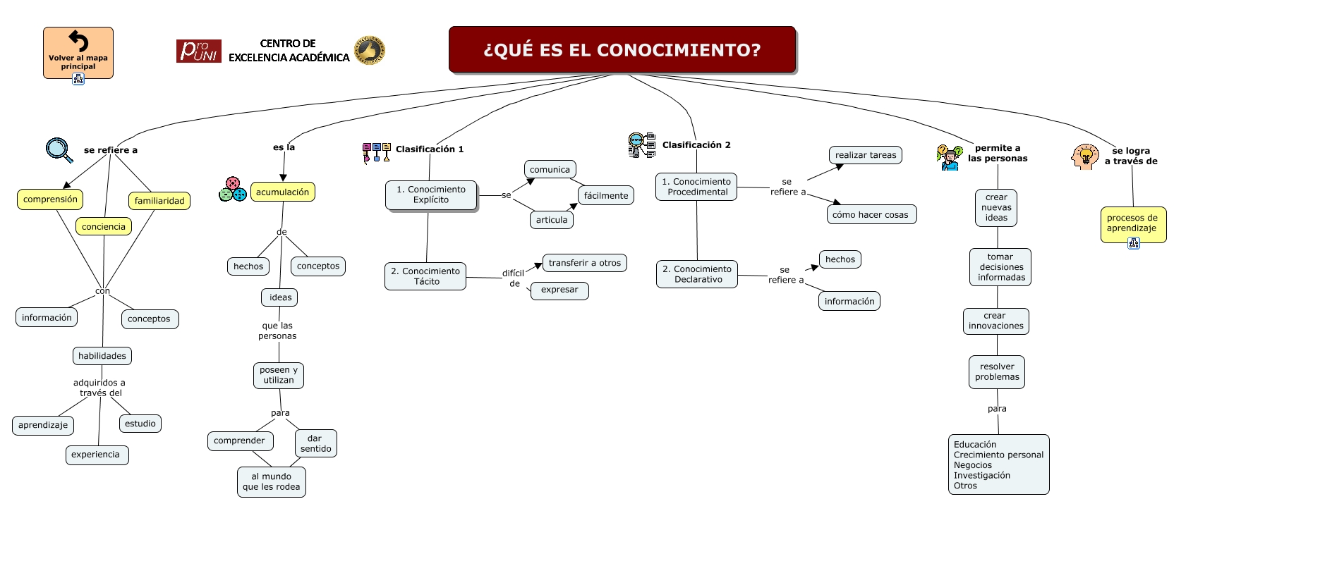 Este Cmap, tiene información relacionada con: QUE ES EL CONOCIMIENTO, poseen y utilizan para comprender, habilidades adquiridos a través del estudio, acumulación de ideas, ¿QUÉ ES EL CONOCIMIENTO? Clasificación 1 2. Conocimiento Tácito, acumulación de hechos, familiaridad con información, ¿QUÉ ES EL CONOCIMIENTO? se refiere a comprensión, comprensión con información, resolver problemas para Educación Crecimiento personal Negocios Investigación Otros, 1. Conocimiento Explícito se comunica, conciencia con habilidades, comprensión con conceptos, ¿QUÉ ES EL CONOCIMIENTO? Clasificación 2 1. Conocimiento Procedimental, acumulación de conceptos, articula fácilmente, familiaridad con conceptos, ¿QUÉ ES EL CONOCIMIENTO? se refiere a conciencia, familiaridad con habilidades, 2. Conocimiento Declarativo se refiere a hechos, ¿QUÉ ES EL CONOCIMIENTO? permite a las personas resolver problemas