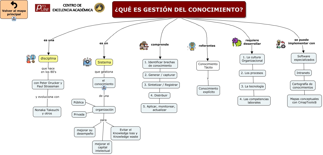 Este Cmap, tiene información relacionada con: Qué es Gestion del Conocimiento, organización Pública, 1. La cultura Organizacional 4. Las competencias laborales, organización para mejorar su desempeño, organización Privada, ¿QUÉ ES GESTIÓN DEL CONOCIMIENTO? es un Sistema, 1. Identificar brechas de conocimiento 5. Aplicar, monitorear, actualizar, organización para Evitar el Knowledge loss y Knowledge waste, organización para mejorar el capital intelectual, ¿QUÉ ES GESTIÓN DEL CONOCIMIENTO? es una disciplina, el conocimiento de una organización, ¿QUÉ ES GESTIÓN DEL CONOCIMIENTO? comprende 1. Identificar brechas de conocimiento, ¿QUÉ ES GESTIÓN DEL CONOCIMIENTO? referentes Conocimiento Tácito, ¿QUÉ ES GESTIÓN DEL CONOCIMIENTO? requiere desarrollar 1. La cultura Organizacional, Software especializados Mapas conceptuales con CmapTools®, ¿QUÉ ES GESTIÓN DEL CONOCIMIENTO? se puede implementar con Software especializados, Conocimiento Tácito y Conocimiento explícito, Sistema que gestiona el conocimiento, con Peter Drucker y Paul Strassman y evoluciona con Nonaka Takeuchi y otros, disciplina que nace en los 80's con Peter Drucker y Paul Strassman