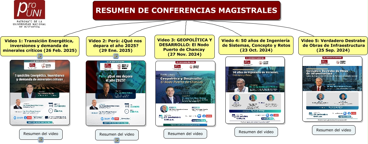 Este Cmap, tiene información relacionada con: RESUMEN DE CONFERENCIAS MAGISTRALES, RESUMEN DE CONFERENCIAS MAGISTRALES Video 5: Verdadero Destrabe de Obras de Infraestructura (25 Sep. 2024), RESUMEN DE CONFERENCIAS MAGISTRALES Video 2: Perú: ¿Qué nos depara el año 2025? (29 Ene. 2025), RESUMEN DE CONFERENCIAS MAGISTRALES Video 3: GEOPOLÍTICA Y DESARROLLO: El Nodo Puerto de Chancay (27 Nov. 2024), RESUMEN DE CONFERENCIAS MAGISTRALES Video 1: Transición Energética, inversiones y demanda de minerales críticos (26 Feb. 2025), RESUMEN DE CONFERENCIAS MAGISTRALES Viedo 4: 50 años de Ingeniería de Sistemas, Concepto y Retos (23 Oct. 2024)