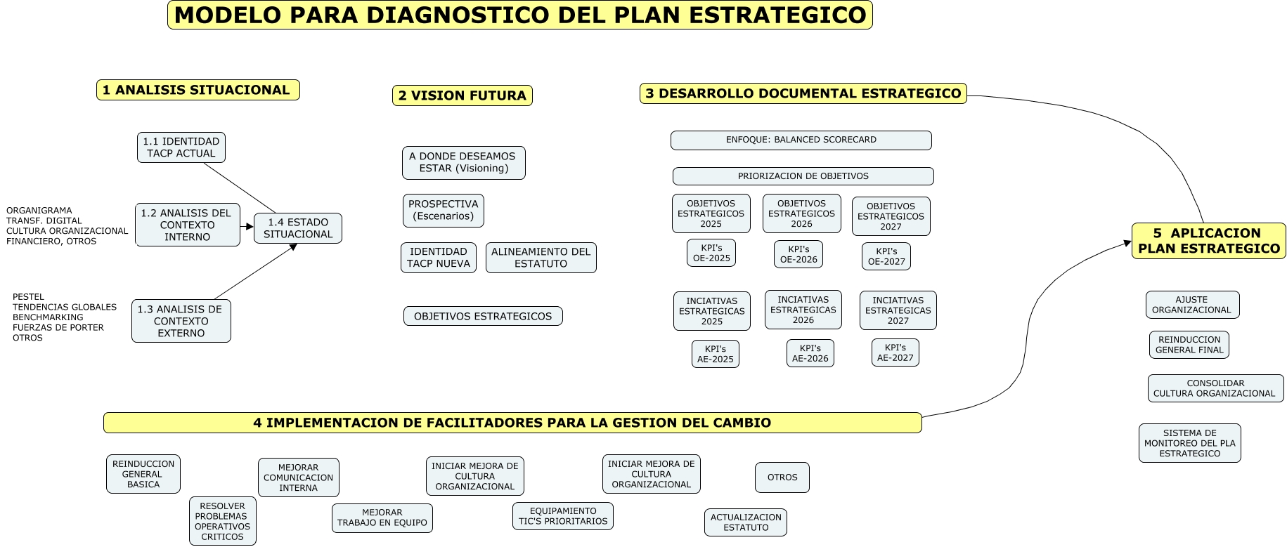 This Concept Map, created with IHMC CmapTools, has information related to: MODELO PARA EL DIAGNOSTICO, 1.3 ANALISIS DE CONTEXTO EXTERNO 1.4 ESTADO SITUACIONAL, 1.2 ANALISIS DEL CONTEXTO INTERNO 1.4 ESTADO SITUACIONAL, 4 IMPLEMENTACION DE FACILITADORES PARA LA GESTION DEL CAMBIO 5 APLICACION PLAN ESTRATEGICO, 3 DESARROLLO DOCUMENTAL ESTRATEGICO 5 APLICACION PLAN ESTRATEGICO, 1.1 IDENTIDAD TACP ACTUAL 1.4 ESTADO SITUACIONAL