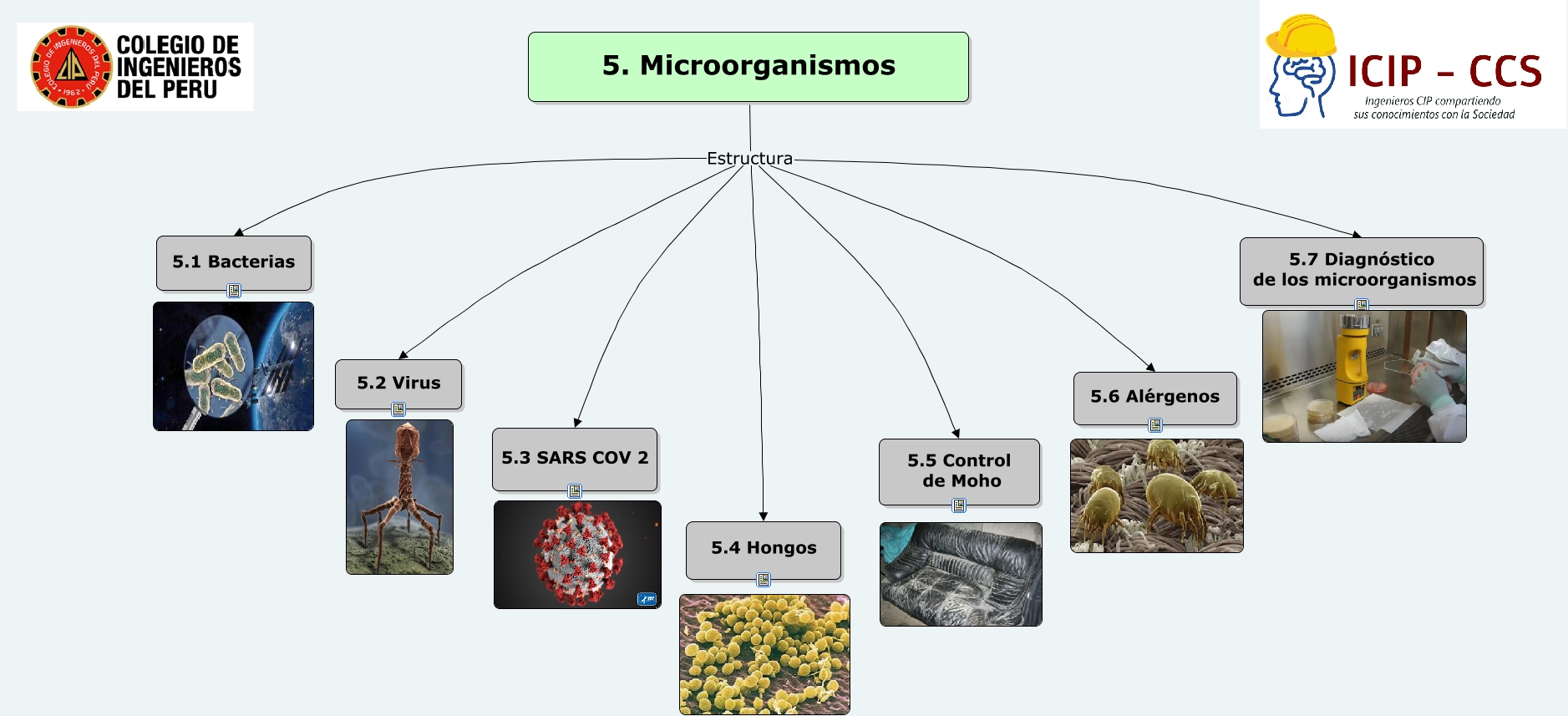 Este Cmap, tiene información relacionada con: Microorganismos, 5. Microorganismos Estructura 5.6 Alérgenos, 5. Microorganismos Estructura 5.3 SARS COV 2, 5. Microorganismos Estructura 5.1 Bacterias, 5. Microorganismos Estructura 5.5 Control de Moho, 5. Microorganismos Estructura 5.2 Virus, 5. Microorganismos Estructura 5.7 Diagnóstico de los microorganismos, 5. Microorganismos Estructura 5.4 Hongos