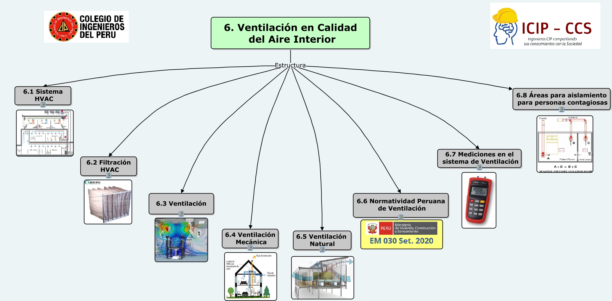 Este Cmap, tiene información relacionada con: Ventilación, 6. Ventilación en Calidad del Aire Interior Estructura 6.4 Ventilación Mecánica, 6. Ventilación en Calidad del Aire Interior Estructura 6.1 Sistema HVAC, 6. Ventilación en Calidad del Aire Interior Estructura 6.8 �?reas para aislamiento para personas contagiosas, 6. Ventilación en Calidad del Aire Interior Estructura 6.5 Ventilación Natural, 6. Ventilación en Calidad del Aire Interior Estructura 6.6 Normatividad Peruana de Ventilación, 6. Ventilación en Calidad del Aire Interior Estructura 6.3 Ventilación, 6. Ventilación en Calidad del Aire Interior Estructura 6.2 Filtración HVAC, 6. Ventilación en Calidad del Aire Interior Estructura 6.7 Mediciones en el sistema de Ventilación