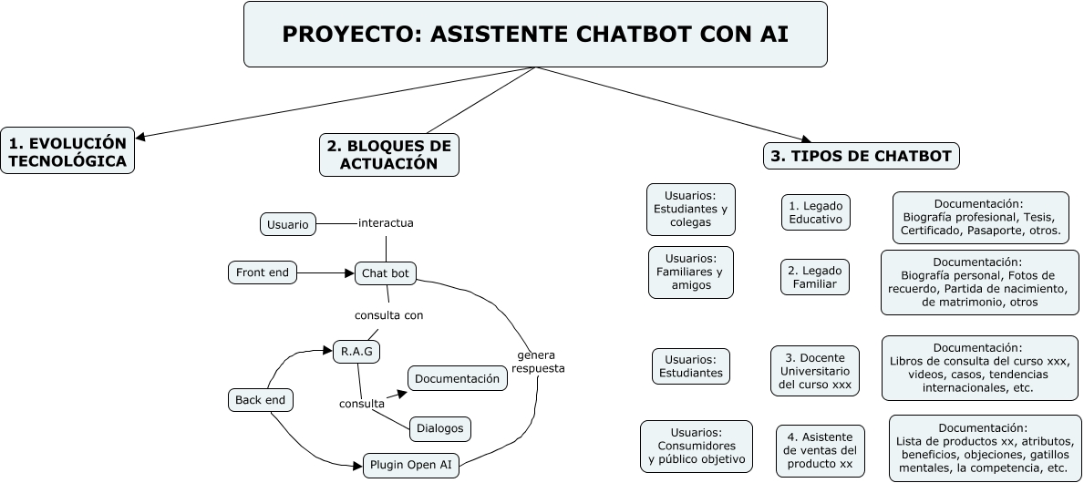 Este Cmap, tiene información relacionada con: PROYECTO - ASISTENTE CAHTBOT AI, Chat bot genera respuesta Plugin Open AI, R.A.G consulta Dialogos, Back end Plugin Open AI, PROYECTO: ASISTENTE CHATBOT CON AI 1. EVOLUCIÓN TECNOLÓGICA, Usuario interactua Chat bot, PROYECTO: ASISTENTE CHATBOT CON AI 2. BLOQUES DE ACTUACIÓN, Back end R.A.G, PROYECTO: ASISTENTE CHATBOT CON AI 3. TIPOS DE CHATBOT, Chat bot consulta con R.A.G, Front end Chat bot, R.A.G consulta Documentación