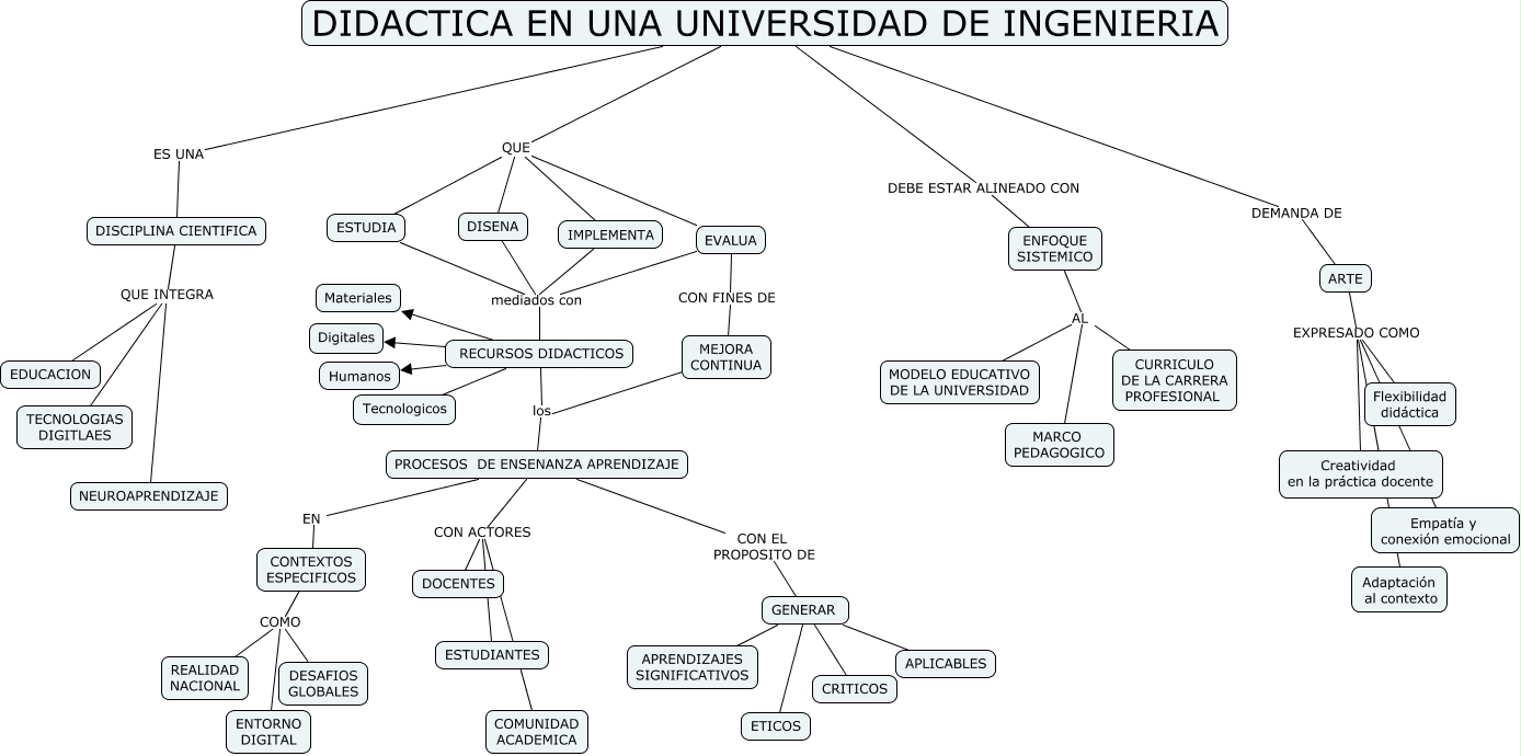 This Concept Map, created with IHMC CmapTools, has information related to: DIDACTICA, DIDACTICA EN UNA UNIVERSIDAD DE INGENIERIA ES UNA DISCIPLINA CIENTIFICA, DIDACTICA EN UNA UNIVERSIDAD DE INGENIERIA QUE IMPLEMENTA, RECURSOS DIDACTICOS Digitales, PROCESOS DE ENSENANZA APRENDIZAJE CON EL PROPOSITO DE GENERAR, DISCIPLINA CIENTIFICA QUE INTEGRA TECNOLOGIAS DIGITLAES, GENERAR CRITICOS, DISENA mediados con RECURSOS DIDACTICOS, ESTUDIA mediados con RECURSOS DIDACTICOS, ENFOQUE SISTEMICO AL MODELO EDUCATIVO DE LA UNIVERSIDAD, EVALUA CON FINES DE MEJORA CONTINUA, DIDACTICA EN UNA UNIVERSIDAD DE INGENIERIA DEMANDA DE ARTE, ARTE EXPRESADO COMO Empatía y conexión emocional, IMPLEMENTA mediados con RECURSOS DIDACTICOS, CONTEXTOS ESPECIFICOS COMO ENTORNO DIGITAL, ENFOQUE SISTEMICO AL CURRICULO DE LA CARRERA PROFESIONAL, RECURSOS DIDACTICOS Tecnologicos, DIDACTICA EN UNA UNIVERSIDAD DE INGENIERIA QUE DISENA, CONTEXTOS ESPECIFICOS COMO REALIDAD NACIONAL, GENERAR APRENDIZAJES SIGNIFICATIVOS, CONTEXTOS ESPECIFICOS COMO DESAFIOS GLOBALES