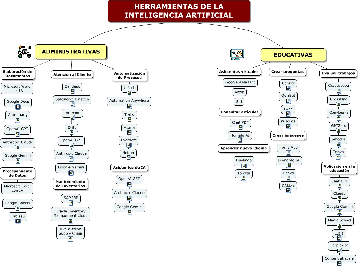 Este Cmap, tiene información relacionada con: HERRAMIENTAS DE LA INTELIGENCIA ARTIFICIAL, ADMINISTRATIVAS Automatización de Procesos, Procesamiento de Datos Tableau, Atención al Cliente Google Gemini, Evaluar trabajos Trinka, ADMINISTRATIVAS Elaboración de Documentos, HERRAMIENTAS DE LA INTELIGENCIA ARTIFICIAL EDUCATIVAS, Consultar artículos Humata AI, Automatización de Procesos Notion, Aplicación en la educación Content at scale, Aprender nuevo idioma TalkPal, Asistentes de IA Google Gemini, Mantenimiento de Inventarios IBM Watson Supply Chain, Crear imágenes DALL-E, EDUCATIVAS Asistentes virtuales, Asistentes virtuales Siri, ADMINISTRATIVAS Atención al Cliente, EDUCATIVAS Evaluar trabajos, HERRAMIENTAS DE LA INTELIGENCIA ARTIFICIAL ADMINISTRATIVAS, Crear preguntas Wisolida, Elaboración de Documentos Google Gemini