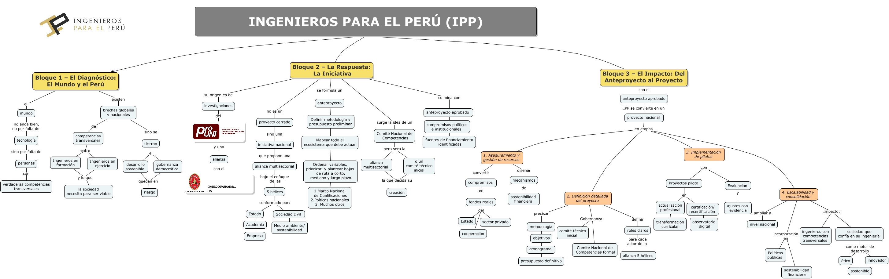 This Concept Map, created with IHMC CmapTools, has information related to: INICIATIVA IPP - v2, fondos reales del sector privado, 1. Aseguramiento y gestión de recursos diseñar mecanismos, alianza multisectorial bajo el enfoque de las 5 hélices, 1. Aseguramiento y gestión de recursos convertir compromisos, actualización profesional transformación curricular, cierran el desarrollo sostenible, anteproyecto Definir metodología y presupuesto preliminar, 4. Escalabilidad y consolidación Impacto: sociedad que confía en su ingeniería, proyecto nacional en etapas 4. Escalabilidad y consolidación, iniciativa nacional que propone una alianza multisectorial, cierran el gobernanza democrática, anteproyecto aprobado IPP se convierte en un proyecto nacional, personas con verdaderas competencias transversales, Bloque 2 – La Respuesta: La Iniciativa culmina con fuentes de financiamiento identificadas, INGENIEROS PARA EL PERÚ (IPP) Bloque 3 – El Impacto: Del Anteproyecto al Proyecto, 4. Escalabilidad y consolidación incorporación en sostenibilidad financiera, investigaciones del, mundo no anda bien, no por falta de tecnología, gobernanza democrática quedan en riesgo, competencias transversales entre Ingenieros en ejercicio