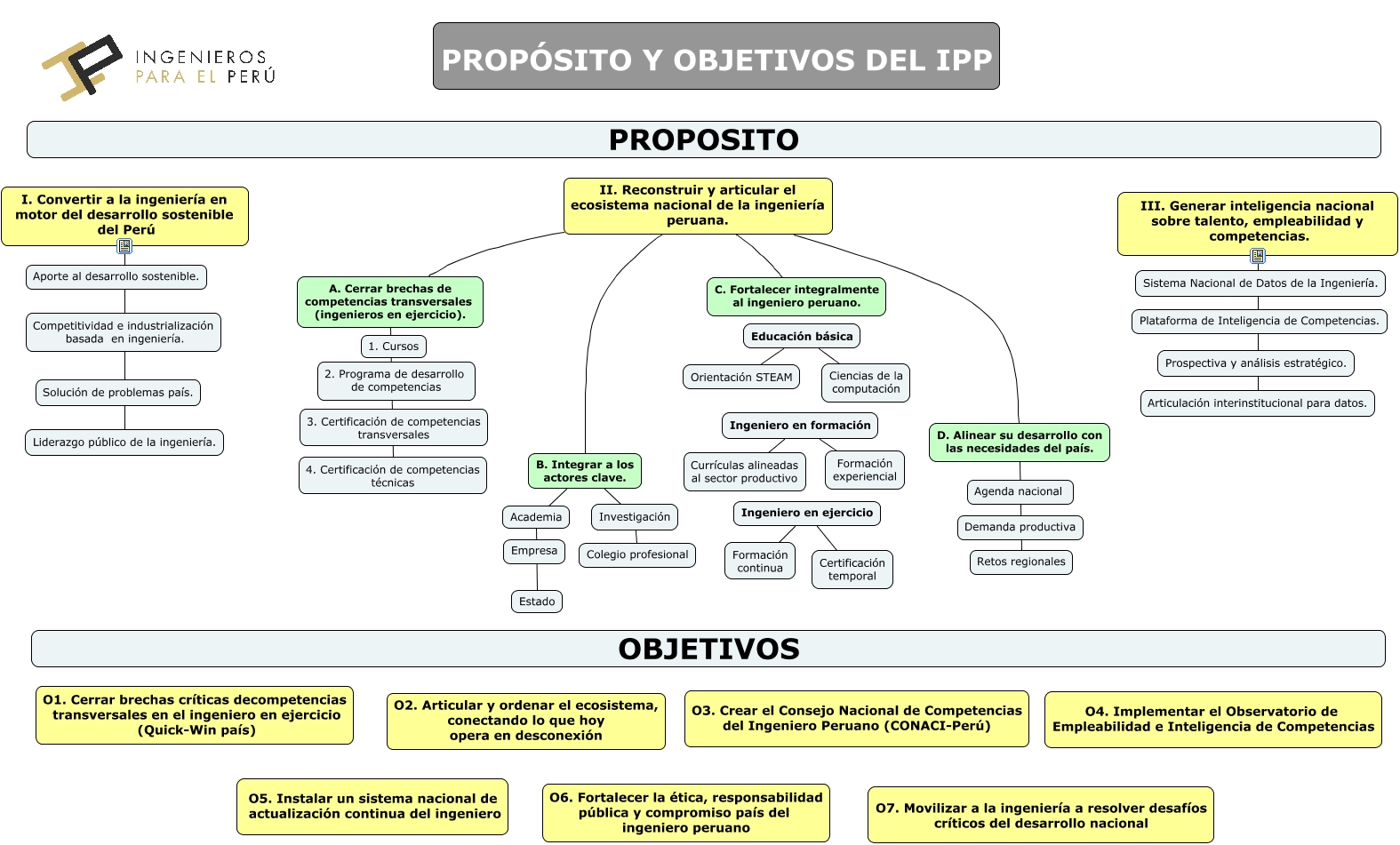 Este Cmap, tiene información relacionada con: PROPOSITO DEL IPP, II. Reconstruir y articular el ecosistema nacional de la ingeniería peruana. D. Alinear su desarrollo con las necesidades del país., Ingeniero en formación Currículas alineadas al sector productivo, B. Integrar a los actores clave. Academia, Ingeniero en formación Formación experiencial, III. Generar inteligencia nacional sobre talento, empleabilidad y competencias. Articulación interinstitucional para datos., Ingeniero en ejercicio Certificación temporal, Investigación Colegio profesional, Academia Estado, Educación básica Orientación STEAM, A. Cerrar brechas de competencias transversales (ingenieros en ejercicio). 4. Certificación de competencias técnicas, D. Alinear su desarrollo con las necesidades del país. Retos regionales, Educación básica Ciencias de la computación, B. Integrar a los actores clave. Investigación, II. Reconstruir y articular el ecosistema nacional de la ingeniería peruana. B. Integrar a los actores clave., Ingeniero en ejercicio Formación continua, II. Reconstruir y articular el ecosistema nacional de la ingeniería peruana. C. Fortalecer integralmente al ingeniero peruano., I. Convertir a la ingeniería en motor del desarrollo sostenible del Perú Liderazgo público de la ingeniería., II. Reconstruir y articular el ecosistema nacional de la ingeniería peruana. A. Cerrar brechas de competencias transversales (ingenieros en ejercicio).
