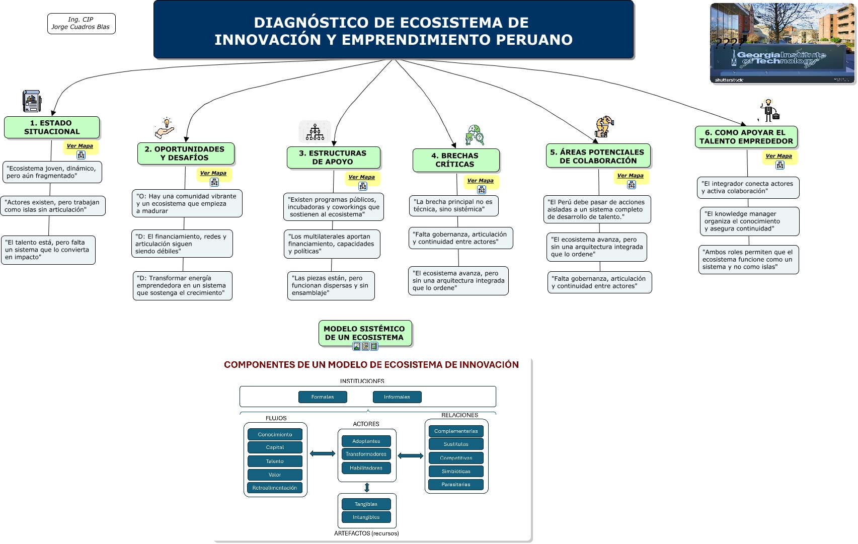 This Concept Map, created with IHMC CmapTools, has information related to: DIAGNÓSTICO DE ECOSISTEMA DE INNOVACIÓN Y EMPRENDIMIENTO PERUANO, 2. OPORTUNIDADES Y DESAFÍOS "D: Transformar energía emprendedora en un sistema que sostenga el crecimiento", DIAGNÓSTICO DE ECOSISTEMA DE INNOVACIÓN Y EMPRENDIMIENTO PERUANO 5. ÁREAS POTENCIALES DE COLABORACIÓN, DIAGNÓSTICO DE ECOSISTEMA DE INNOVACIÓN Y EMPRENDIMIENTO PERUANO 6. COMO APOYAR EL TALENTO EMPREDEDOR, 1. ESTADO SITUACIONAL "El talento está, pero falta un sistema que lo convierta en impacto", DIAGNÓSTICO DE ECOSISTEMA DE INNOVACIÓN Y EMPRENDIMIENTO PERUANO 2. OPORTUNIDADES Y DESAFÍOS, DIAGNÓSTICO DE ECOSISTEMA DE INNOVACIÓN Y EMPRENDIMIENTO PERUANO 3. ESTRUCTURAS DE APOYO, DIAGNÓSTICO DE ECOSISTEMA DE INNOVACIÓN Y EMPRENDIMIENTO PERUANO 1. ESTADO SITUACIONAL, 6. COMO APOYAR EL TALENTO EMPREDEDOR "Ambos roles permiten que el ecosistema funcione como un sistema y no como islas", 5. ÁREAS POTENCIALES DE COLABORACIÓN "Falta gobernanza, articulación y continuidad entre actores", 3. ESTRUCTURAS DE APOYO "Las piezas están, pero funcionan dispersas y sin ensamblaje", DIAGNÓSTICO DE ECOSISTEMA DE INNOVACIÓN Y EMPRENDIMIENTO PERUANO 4. BRECHAS CRÍTICAS, 4. BRECHAS CRÍTICAS "El ecosistema avanza, pero sin una arquitectura integrada que lo ordene"