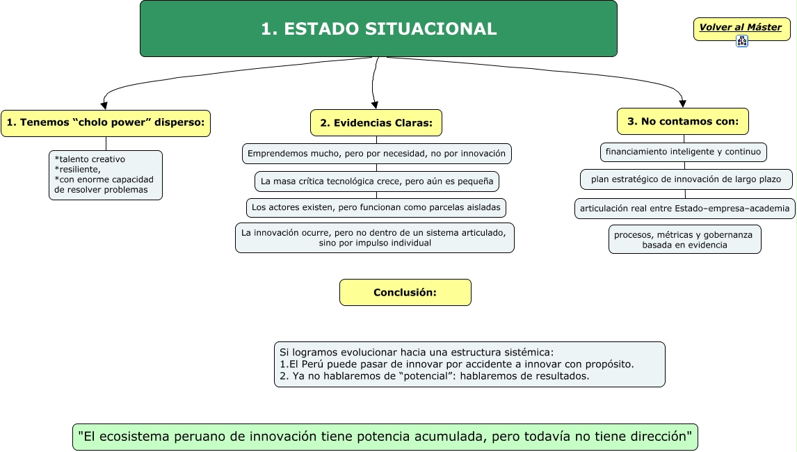 This Concept Map, created with IHMC CmapTools, has information related to: 1. ESTADO SITUACIONAL, 1. ESTADO SITUACIONAL 3. No contamos con:, 2. Evidencias Claras: Los actores existen, pero funcionan como parcelas aisladas, 1. ESTADO SITUACIONAL 1. Tenemos “cholo power” disperso:, 3. No contamos con: articulación real entre Estado–empresa–academia, 1. ESTADO SITUACIONAL 2. Evidencias Claras:, 1. Tenemos “cholo power” disperso: *talento creativo *resiliente, *con enorme capacidad de resolver problemas