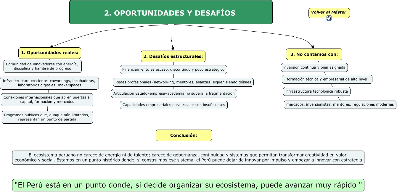 This Concept Map, created with IHMC CmapTools, has information related to: 2. OPORTUNIDADES Y DESAFÍOS, 2. Desafíos estructurales: Capacidades empresariales para escalar son insuficientes, 2. OPORTUNIDADES Y DESAFÍOS 1. Oportunidades reales:, 2. OPORTUNIDADES Y DESAFÍOS 2. Desafíos estructurales:, 2. OPORTUNIDADES Y DESAFÍOS 3. No contamos con:, 3. No contamos con: mercados, inversionistas, mentores, regulaciones modernas, 1. Oportunidades reales: Programas públicos que, aunque aún limitados, representan un punto de partida