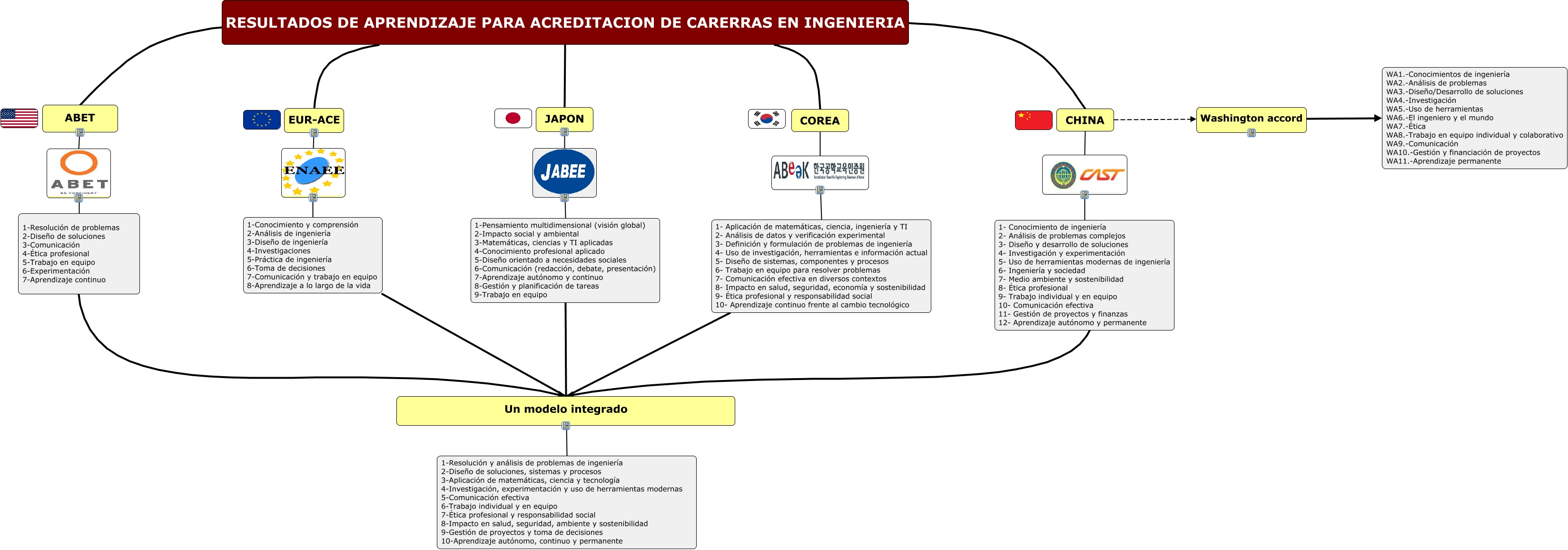 Este Cmap, tiene información relacionada con: STUDENS OUTCOMES (MAPA CONCEPTAUAL), 1- Aplicación de matemáticas, ciencia, ingeniería y TI 2- Análisis de datos y verificación experimental 3- Definición y formulación de problemas de ingeniería 4- Uso de investigación, herramientas e información actual 5- Diseño de sistemas, componentes y procesos 6- Trabajo en equipo para resolver problemas 7- Comunicación efectiva en diversos contextos 8- Impacto en salud, seguridad, economía y sostenibilidad 9- Ética profesional y responsabilidad social 10- Aprendizaje continuo frente al cambio tecnológico Un modelo integrado, RESULTADOS DE APRENDIZAJE PARA ACREDITACION DE CARERRAS EN INGENIERIA EUR-ACE, 1-Pensamiento multidimensional (visión global) 2-Impacto social y ambiental 3-Matemáticas, ciencias y TI aplicadas 4-Conocimiento profesional aplicado 5-Diseño orientado a necesidades sociales 6-Comunicación (redacción, debate, presentación) 7-Aprendizaje autónomo y continuo 8-Gestión y planificación de tareas 9-Trabajo en equipo Un modelo integrado, Un modelo integrado 1-Resolución y análisis de problemas de ingeniería 2-Diseño de soluciones, sistemas y procesos 3-Aplicación de matemáticas, ciencia y tecnología 4-Investigación, experimentación y uso de herramientas modernas 5-Comunicación efectiva 6-Trabajo individual y en equipo 7-Ética profesional y responsabilidad social 8-Impacto en salud, seguridad, ambiente y sostenibilidad 9-Gestión de proyectos y toma de decisiones 10-Aprendizaje autónomo, continuo y permanente, 1-Conocimiento y comprensión 2-Análisis de ingeniería 3-Diseño de ingeniería 4-Investigaciones 5-Práctica de ingeniería 6-Toma de decisiones 7-Comunicación y trabajo en equipo 8-Aprendizaje a lo largo de la vida, RESULTADOS DE APRENDIZAJE PARA ACREDITACION DE CARERRAS EN INGENIERIA JAPON, RESULTADOS DE APRENDIZAJE PARA ACREDITACION DE CARERRAS EN INGENIERIA ABET, EUR-ACE, COREA, RESULTADOS DE APRENDIZAJE PARA ACREDITACION DE CARERRAS EN INGENIERIA COREA, JAPON, 1-Pensamiento multidimensional (visión global) 2-Impacto social y ambiental 3-Matemáticas, ciencias y TI aplicadas 4-Conocimiento profesional aplicado 5-Diseño orientado a necesidades sociales 6-Comunicación (redacción, debate, presentación) 7-Aprendizaje autónomo y continuo 8-Gestión y planificación de tareas 9-Trabajo en equipo, CHINA Washington accord, RESULTADOS DE APRENDIZAJE PARA ACREDITACION DE CARERRAS EN INGENIERIA CHINA, 1- Aplicación de matemáticas, ciencia, ingeniería y TI 2- Análisis de datos y verificación experimental 3- Definición y formulación de problemas de ingeniería 4- Uso de investigación, herramientas e información actual 5- Diseño de sistemas, componentes y procesos 6- Trabajo en equipo para resolver problemas 7- Comunicación efectiva en diversos contextos 8- Impacto en salud, seguridad, economía y sostenibilidad 9- Ética profesional y responsabilidad social 10- Aprendizaje continuo frente al cambio tecnológico, 1-Conocimiento y comprensión 2-Análisis de ingeniería 3-Diseño de ingeniería 4-Investigaciones 5-Práctica de ingeniería 6-Toma de decisiones 7-Comunicación y trabajo en equipo 8-Aprendizaje a lo largo de la vida Un modelo integrado, Washington accord WA1.-Conocimientos de ingeniería WA2.-Análisis de problemas WA3.-Diseño/Desarrollo de soluciones WA4.-Investigación WA5.-Uso de herramientas WA6.-El ingeniero y el mundo WA7.-Ética WA8.-Trabajo en equipo individual y colaborativo WA9.-Comunicación WA10.-Gestión y financiación de proyectos WA11.-Aprendizaje permanente, 1- Conocimiento de ingeniería 2- Análisis de problemas complejos 3- Diseño y desarrollo de soluciones 4- Investigación y experimentación 5- Uso de herramientas modernas de ingeniería 6- Ingeniería y sociedad 7- Medio ambiente y sostenibilidad 8- Ética profesional 9- Trabajo individual y en equipo 10- Comunicación efectiva 11- Gestión de proyectos y finanzas 12- Aprendizaje autónomo y permanente, 1-Resolución de problemas 2-Diseño de soluciones 3-Comunicación 4-Ética profesional 5-Trabajo en equipo 6-Experimentación 7-Aprendizaje continuo Un modelo integrado, ABET
